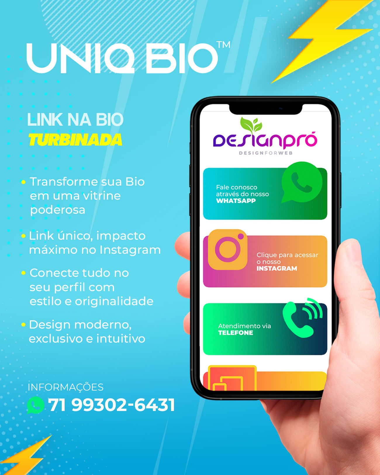Transforme sua Bio em uma vitrine poderosa. Link único, impacto máximo no Instagram. Conecte tudo no seu perfil num único clique, com estilo e originalidade. Um link na bio com design moderno que valoriza seu nome ou sua marca, aumenta suas vendas ou simplesmente destaca seu perfil.
